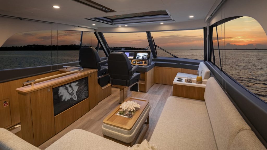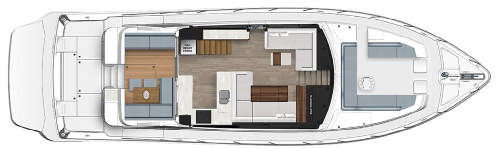 Le nouveau 58 propose tous les essentiels de SMY, comprenant un cockpit spacieux et clair pour les sports nautiques, terrasse latérale pour se promener, Salon et espace de divertissement sur le pont avant, terrasse extérieure tous temps, salon spacieux et luxueux avec escalier intérieur menant à un flybridge entièrement fermé avec climatisation et poste de pilotage ultramoderne.